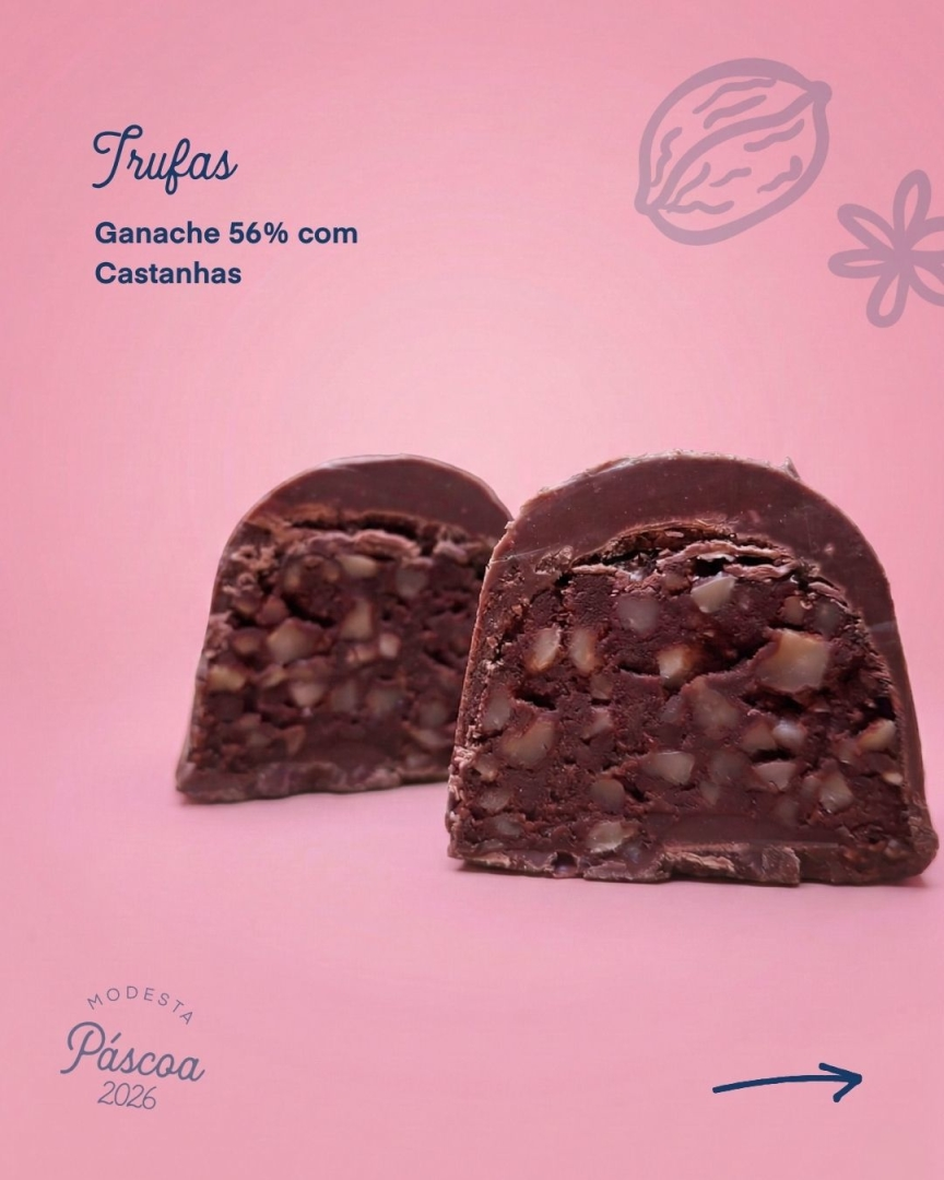 Chocolate 56% cacau com recheio de ganache e castanha de caju.