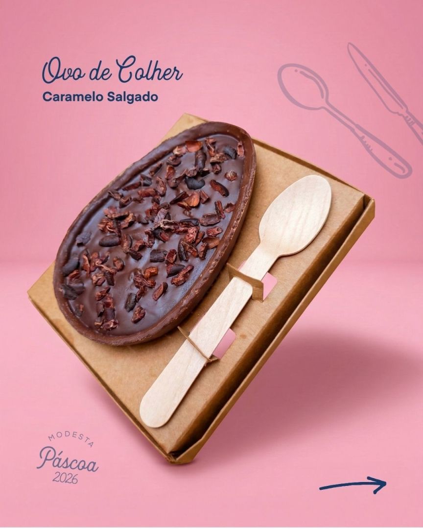 INGREDIENTES: Casca de chocolate preto com recheio da Tortinha de Caramelo da Modesta: ganache de chocolate,caramelo salgado, nibs de cacau e farofa de biscoito.