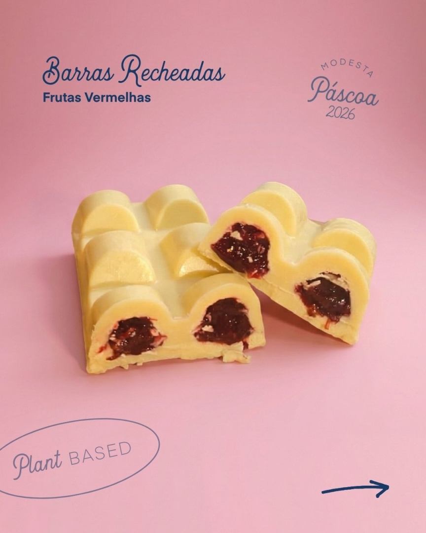 INGREDIENTES: Chocolate branco com recheio de geleia de frutas vermelhas